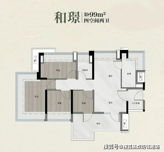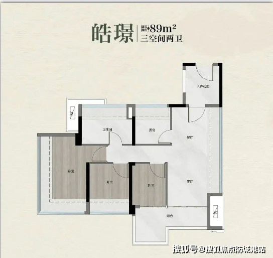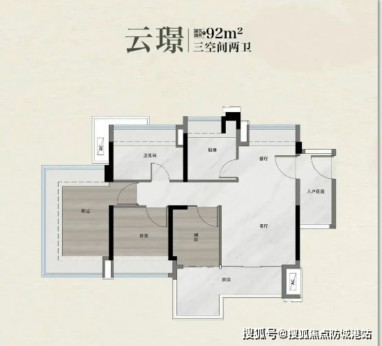 建面约 92㎡户型同样亮点十足,卧室全部南向,入户玄关设计与 89㎡户型有所区别,更注重私密性。L 型长阳台堪称 “百宝箱”,功能百变多样:可打造洗衣房 + 家务间,容纳洗衣机、烘干机等各类家电;可改造为茶室,供家人品茗悟道;也可变身家庭健身房,满足日常运动需求;还能将突出部分纳入卧室,打造大次卧,提升居住舒适度。