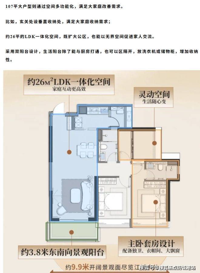 户型设计贴合不同需求,共 4 栋 44 - 46 层超高层住宅,在售 D 栋,ABC 栋为准现房。87 平小户型少承重墙化设计,次卧灵活可变,生活阳台与厨房可打通,主卧独立卫浴,优于市面同面积产品。107 平大户型空间多功能化,玄关垂直收纳,26 平 LDK 一体化空间,双阳台设计,增加收纳与交流空间。全屋配置中央空调、新风系统等,交标甄选一线品牌,品质高端。