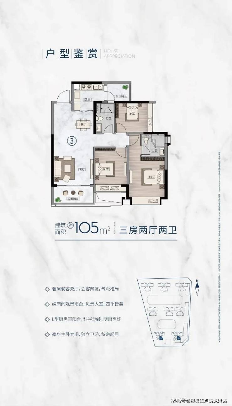 108㎡三房两厅两卫:三开间朝南,主卧带独立卫浴,U型厨房动线合理,总价约378万元/套起。