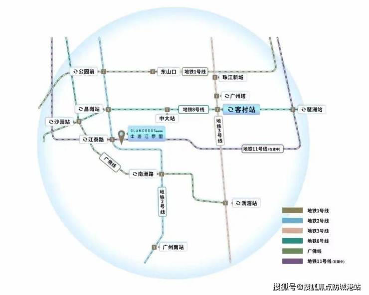 中海江泰里,海珠区文商旅融合圈地理中芯、广州未来文化经济中芯CCD,周边3公里分布2号线、8号线、广佛线以及在建的11号线,经地铁3站到中大,7站到珠江新城、琶洲,8站东山口。