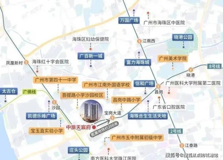 交通是中旅·天宸府的一大亮点。项目距离8号线宝岗大道站C口仅约150米,步行即可到达地铁入口,实现无缝衔接城市轨道交通网络。通过8号线,住户可快速直达琶洲会展区、越秀海珠广场、北京路商圈及珠江新城。接驳广佛线后,荔湾、芳村等老城区也可轻松到达,实现全城高效通勤。