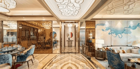 奢阔尺度:约50平方米的礼宾级会客厅,采用故宫美学十字中轴九宫格布局,诠释了极致的舒适与仪式感。