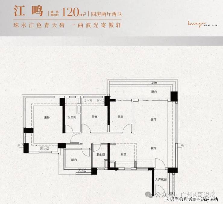 建面约120㎡:四房两厅两卫设计,四开间朝南,居住与生活动静分离,南向大阳台或南北双阳台,主卧带270°飘窗。