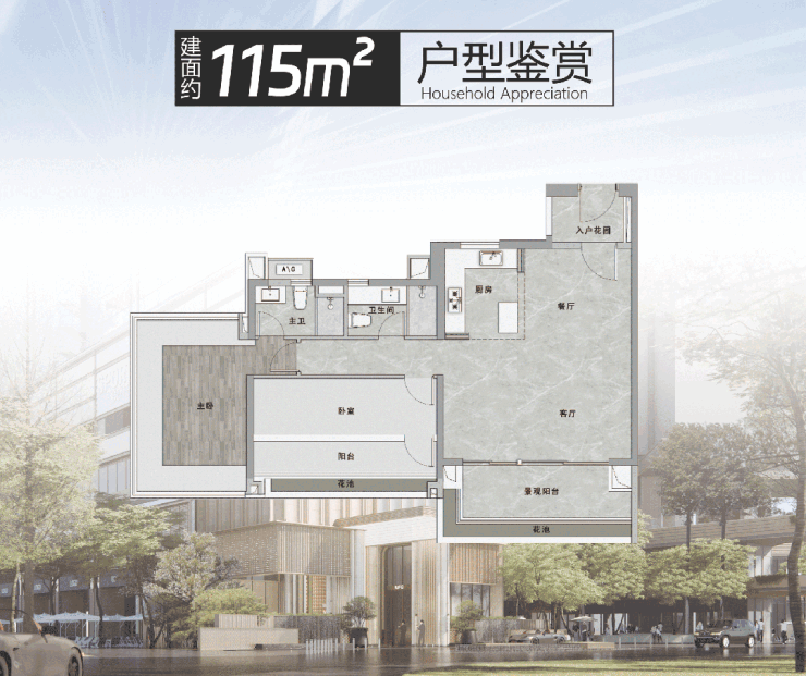 建面约115㎡户型做到5开间朝南,公区LDKB一体化设计满足不同的社交场景。主套房约270°的环幕飘窗,实现悦己居住享受。