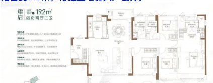 192㎡户型:4房2厅4卫设计,五开间朝南,客厅开间约6.3米,阳台长度达9.8米,配备独立电梯入户。