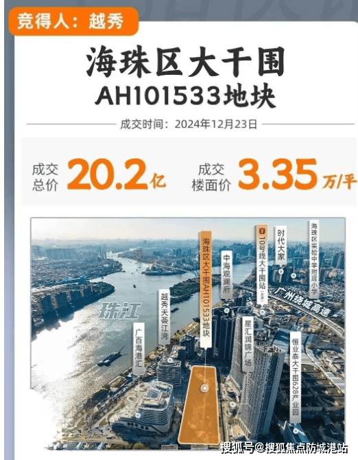 越秀江湾潮起地块的出让与开发过程,尽显国企的实力与效率。2024年10月18日,大干围AH101533地块由商业用地调整为居住用地;11月13日,地块由广州土发中心收储,越秀地产获得15.29亿元现金补偿;11月21日地块挂牌,12月23日越秀地产以20.23亿元成功竞得,楼面价33501元/㎡,整个流程干脆利落,彰显了项目开发的稳定性与确定性。