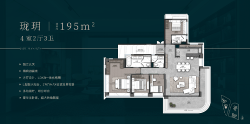 第六种主力户型:建面约195㎡纯四房三卫(珑玥户型),该户型为项目高端雅奢大平层户型,贴合多人口高端家庭、精英改善人群的居住需求与预算,空间尺度极致升级,品质感与尊崇感拉满,是高端改善人群的理想选择。该户型在其他户型的基础上,优化空间布局,增加了卫生间数量与公共区域、卧室的空间尺度,进一步提升居住舒适度与便捷性,同时保留南北通透、LDKG一体化布局、270°环幕观景面等核心优势,实用性与品质感兼具,彰显精英人居质感。