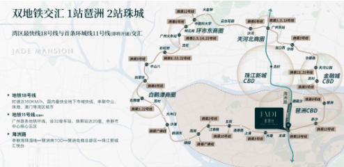 地铁出行方面,项目坐拥地铁11号线(在建中)+18号线双轨交汇枢纽,实现双地铁入户,是琶洲核芯罕见的双地铁高端住宅,完美契合用户对便捷通勤的需求。其中地铁18号线作为国内最快全地下市域快线,串联中山、珠海、澳门等湾区城市,从项目出发,1站可达琶洲核心商圈,2站直达珠江新城,3站抵达金融城,零换乘即可通达全城各大核心商圈与高端居住区,极大节省通勤时间,满足业主日常通勤、休闲购物、商务出行等多元需求;地铁11号线(在建中)是广州首条地铁环线,设32座车站、换乘站达20座,建成后将串联广州各大行政区,进一步提升出行便捷度,让业主轻松畅达全城。同时,项目临近海洲路,该道路串联海珠湿地-琶洲南TOD-琶洲电商总部-珠江新城汇悦台,进一步完善交通路网,提升出行效率。