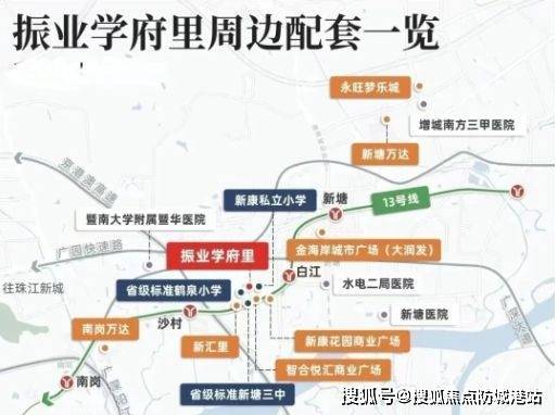 振业学府里地处增城新塘板块,紧邻13号线沙村站,距离白江站约一站路,形成对区域主要通勤节点的便捷接入。地铁13号线可直达黄埔区及天河区核心地段,接驳广州市中心与主要产业区,提供高效的通勤条件。