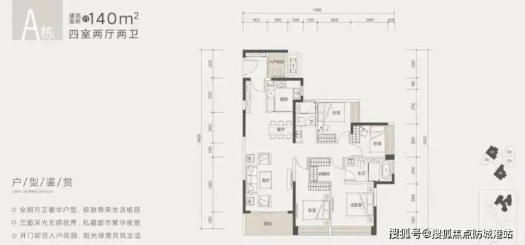 建面约140㎡四房两厅两卫:此户型是项目的绝对主力,货量充足,分为横厅与竖厅两种设计。横厅户型客厅开间宽阔,连接阳台,空间感强;竖厅户型动静分区更为传统。部分南向户型可享小区内部花园景观,居住舒适度与私密性更佳。