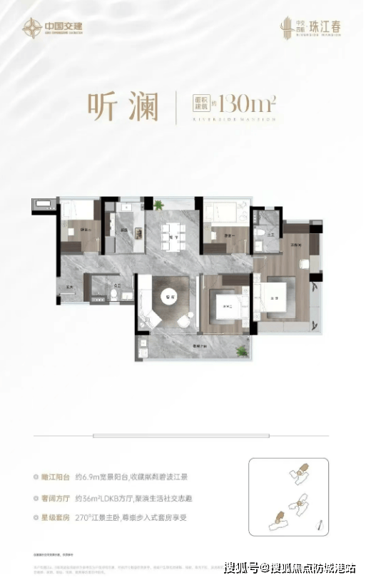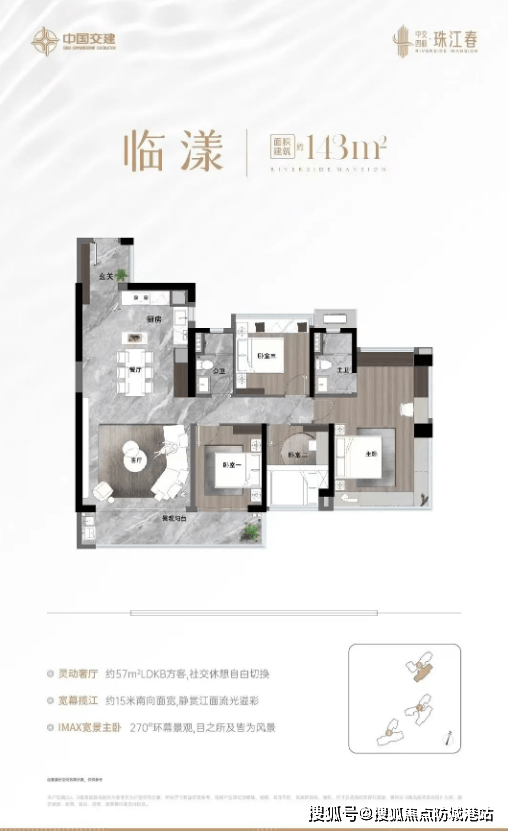 项目首期推出6#、8#栋(部分资料提及7#),均为超高层住宅,采用3梯3户或3梯4户设计,主力户型为建面130㎡、143㎡、165㎡、180㎡四房大平层,全部为南向望江布局,确保圈层纯粹性与居住私密性。