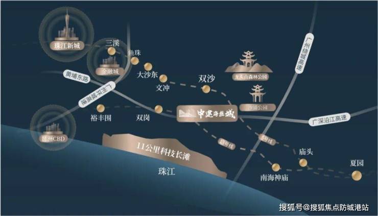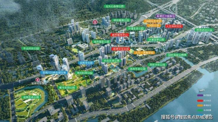 项目背靠5000亩龙头山森林公园,南面望珠江,地块约90%界面朝向公园。片区整体按“300米见绿、500米见园”标准建设,除了龙头山,还有牛山炮台公园、沙浦生态公园等5大城市公园,以及9个主题社区公园。比如“缤纷童趣公园”会嵌入互动水景,“龙舟生态公园”则结合本地文化做滨水步道。