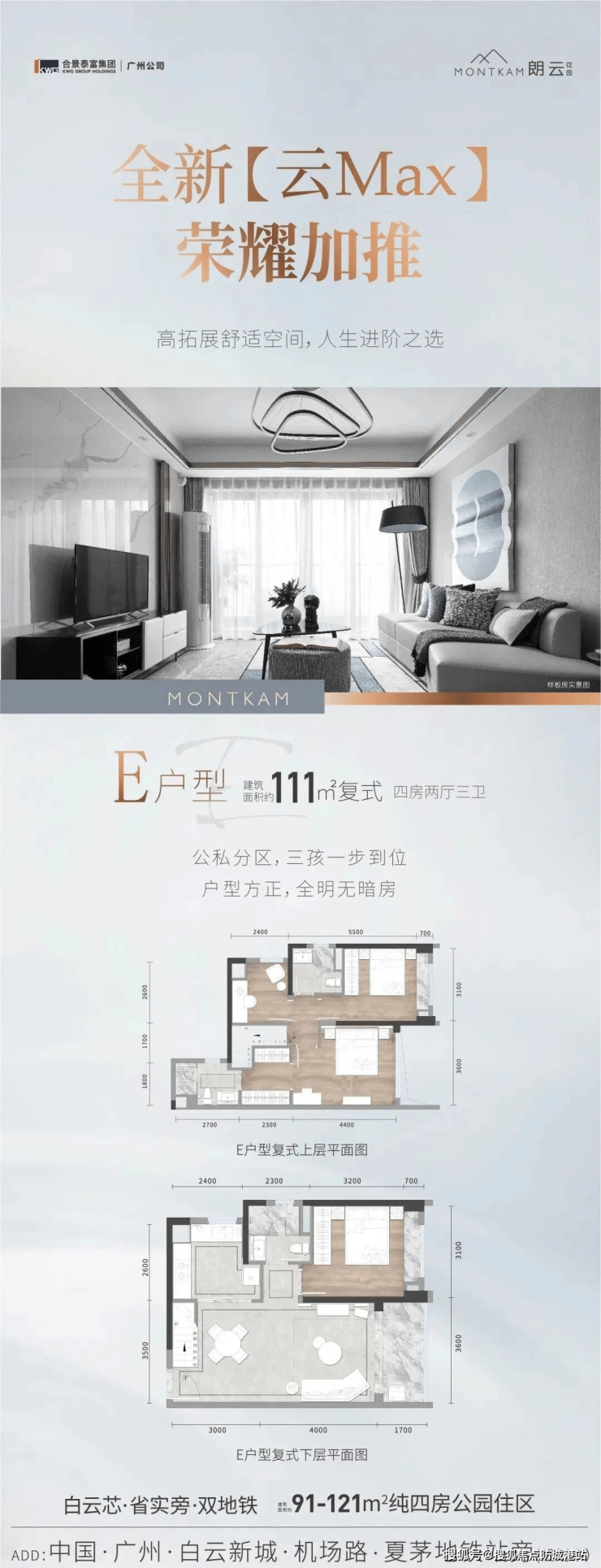 项目户型设计贴合现代家庭需求,高拓展空间与实用布局兼具。建面约 111㎡复式四房两厅三卫,是三胎家庭及多代同堂的优选户型,高拓展设计实现空间利用率最大化。三个卫生间的配置充分保障家庭成员私密性,主卧超大套房设计提升居住舒适度,上下层动静分区明确,户型方正且全明无暗房,采光通风俱佳。建面约 120㎡平层四房两厅两卫,东望白云山景,双阳台设计拓展景观视野。4 开间朝南,南北对流,空间布局舒适合理,偶数梯层专梯专户,搭配入户玄关与可改造入户花园,既保障归家礼遇,又满足个性化居住需求。