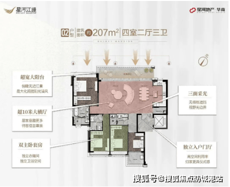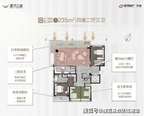 『星河江缦』提供多种户型选择,面积从179平方米到235平方米不等,均为四房大平层设计。所有户型均采用了双套房设计,部分户型更是实现了南北对流,保证了室内的通风和采光效果。特别是235平方米的户型,不仅享有超宽大阳台,还配备了高得房率和三卫浴空间,充分满足了高端客户对于居住空间的需求。项目还特别注重细节设计,如LOW-E玻璃的应用、LDKB一体化设计等,提升了整体居住体验。