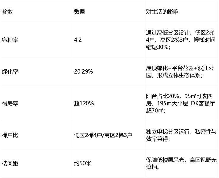 超120%使用率:通过阳台占比20%、新规户型设计,打破传统空间局限,95㎡可改四房,195㎡大平层LDK客餐厅超70㎡;