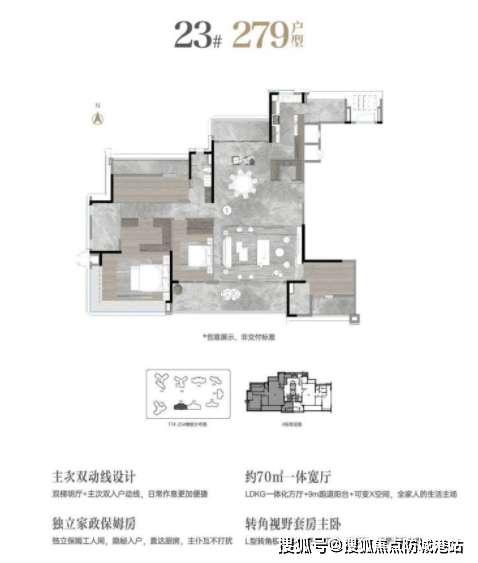 279平方米的五房两厅四卫户型,是大平层的主力户型。该户型采用双梯入户设计,配备超10平方米入户前厅,尊贵感十足。全明格局且动静分离,超70平方米的超级客厅采用无墙柱设计,搭配约9.3米长IMAX景观阳台,视野开阔。全屋南向5.5开间,约53平方米超级主卧带270°景观飘窗,精装标配日本YKK系统门窗等高端配置。