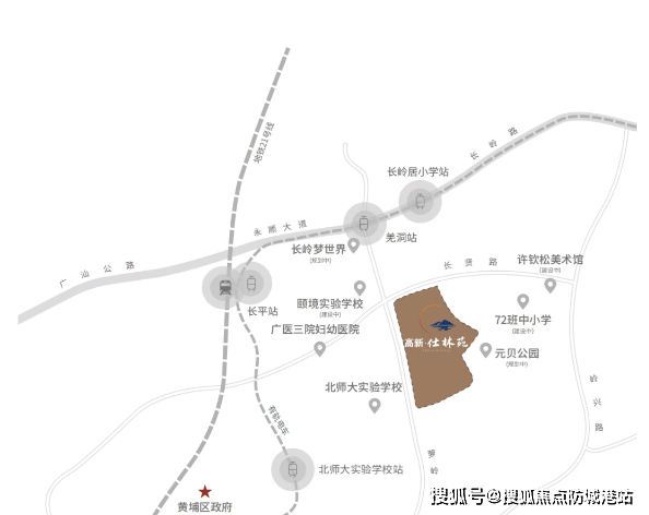 从现有交通来看,项目周边拥有 2 大轨道交通与 5 大城市主脉。直线距离约 800 米即可到达地铁 21 号线长平站,通过地铁 21 号线,居民可以 1 站到达黄埔区府(水西站)、2 站到达万达广场(苏元站)、5 站到达天河(天河智慧城站),快速畅达城市各大核心区域。同时,步行约 400 米即可到达有轨电车 1 号线羌洞站,1 站即可换乘地铁 21 号线,进一步拓展了居民的出行范围。