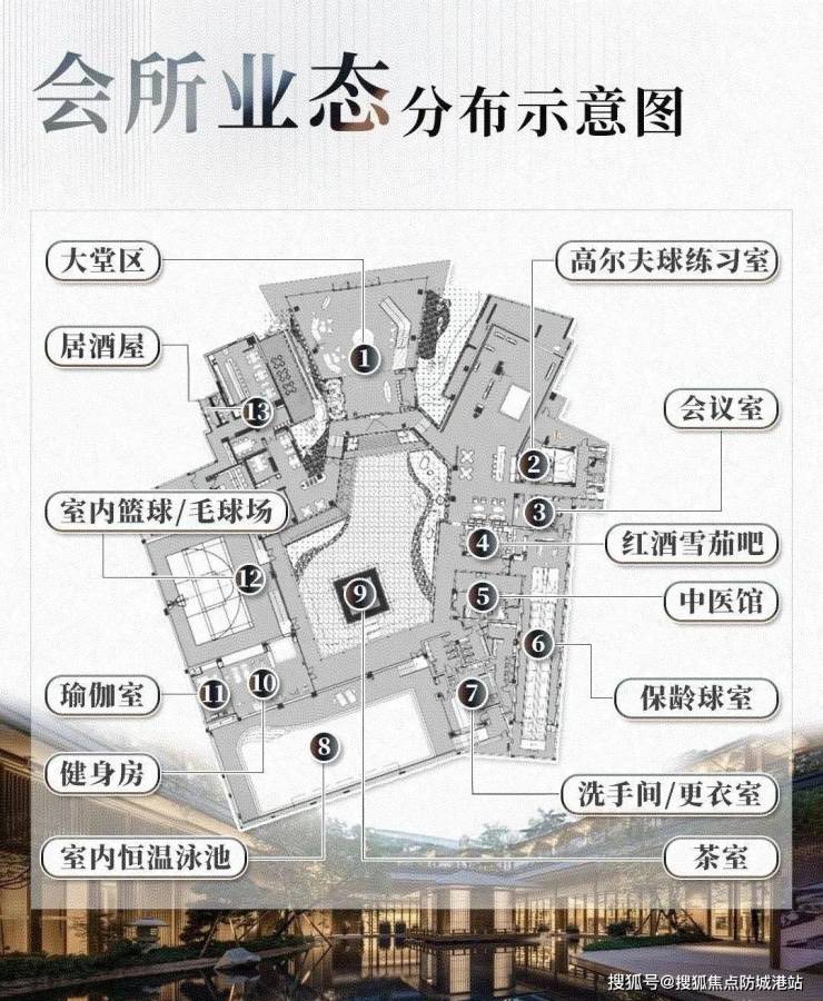 项目配套设施齐全,除了常见的恒温泳池、健身房外,还有红酒雪茄吧、保龄球馆、高尔夫练习室等圈层专属配套,满足业主多样化的生活需求。值得一提的是,小区内的会所——臻庭,占地约2500平方米,包含地上、地面、地下三层空间,打造了一个立体多变的景致空间。