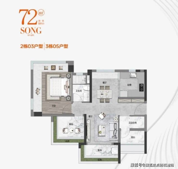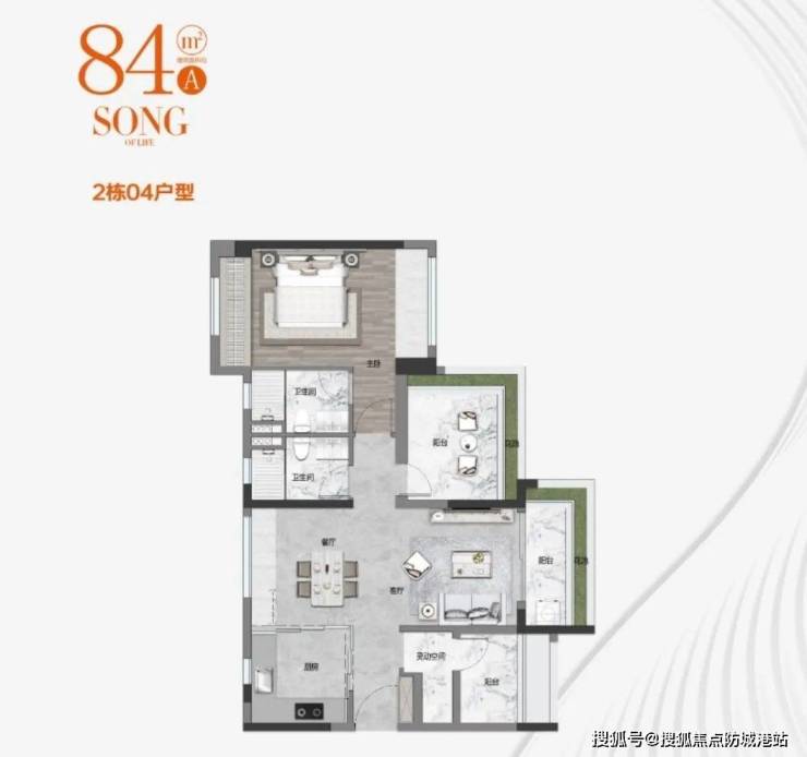 84㎡,是三房两厅两卫,南北对流,横厅设计,跟72平的户型差不多,虽然取消了270度飘窗设计,但多了一个卫生间,实用率提高了不少。