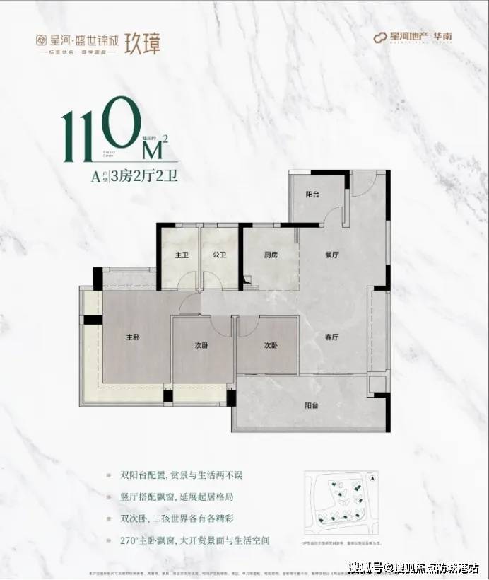 98㎡三房:270°无柱飘窗设计,次卧面宽达3.3米,得房率99%;