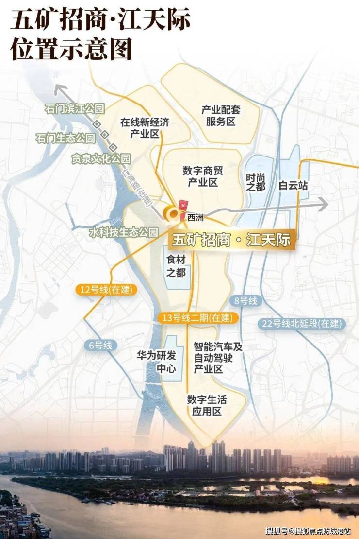 招商江天际由招商蛇口(股票代码:001979)倾力打造,项目位于广州白云区罗冲围板块,紧邻珠江前航道,是广州“十四五”规划中“数字经济产业走廊”的核心节点。项目总占地面积约8.3万㎡,总建筑面积约35万㎡,规划有12栋高层住宅、2栋商业综合体及1所国际幼儿园,绿化率高达35%,是集居住、商业、教育于一体的全能型社区。