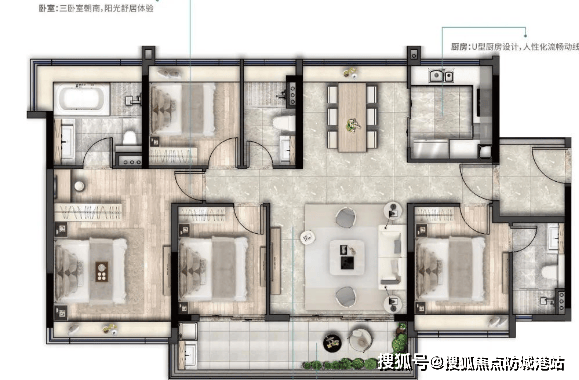 亮点:南北通透,主卧套房设计带独立卫浴;客厅开间3.6米,连接景观阳台,采光极佳;多功能房可灵活调整为茶室或客房。