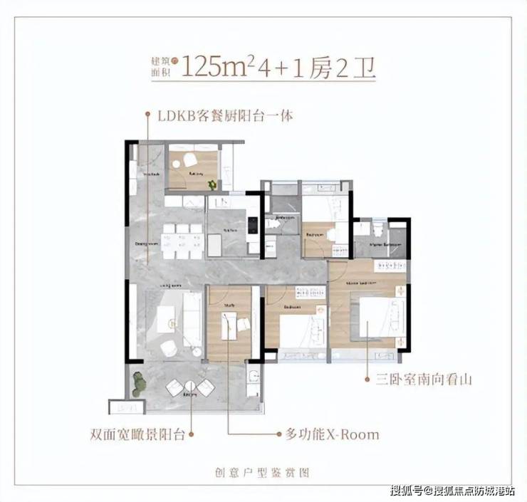 接下来是125平方米的A户型,这是一个四加一房两卫的设计,非常适合大家庭或者需要额外工作空间的人士。该户型的一大亮点是其超大的阳台,直接连通客厅和次卧,不仅扩大了视野,还为室内引入了充足的自然光线。阳台部分可以布置成一个小花园或者休闲区,成为家中最惬意的一角。四个卧室分布得当,每个房间都有良好的采光和通风条件。主卧配备了步入式衣帽间,满足现代人对收纳空间的需求。此外,还有一个多功能房可以根据个人喜好灵活运用,既可以作为书房也可以改造为健身房,甚至是一个小型的娱乐室。