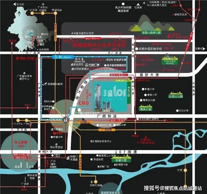 强区位占位广深科创走廊的核心—广州东TOD国际新城之上,位于三大核交汇处