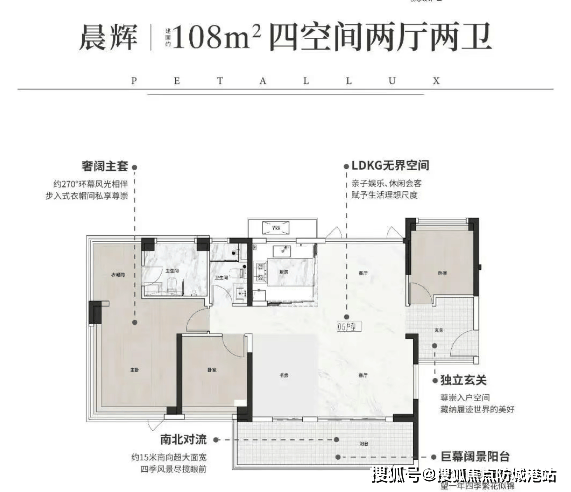 高效使用率:户型面积从75至108平方米不等,三至四房设计,最高使用率达120%,最大化利用空间。