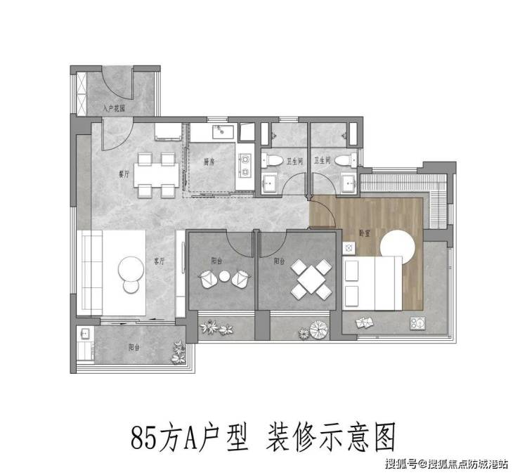 85㎡三房两厅两卫:四开间朝南,客餐厅开间约3.8米,主卧开间约3.7米,南北通透无阻。