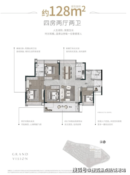 128㎡四房两厅两卫,约 6.7 米南向阔绰阳台,四开间南向采光,南北对流,舒适入户花园增加收纳与安全空间,主卧尊享生活享受。