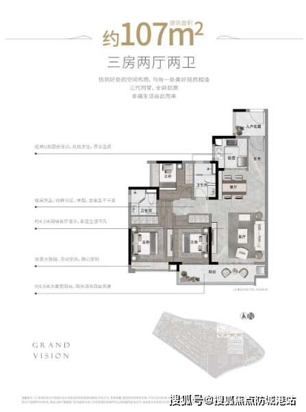 107㎡三房两厅两卫,约 6.6 米大面宽阳台,阳光清风入室,约 4.2 米阔绰客厅,大尺寸主卧套房搭配观景大飘窗,空间可随心定制。
