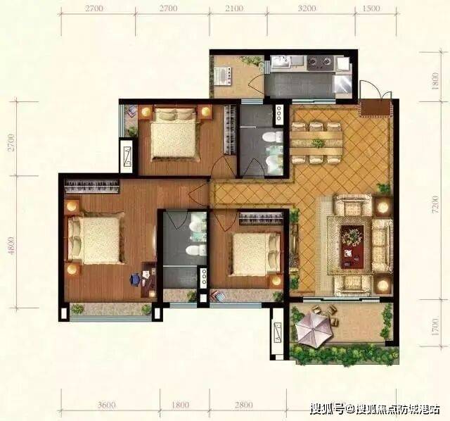 三房两厅两卫,厅房全南朝向,主套房设计。双阳台设计提升了实用率,充足的阳光照射营造了舒适的居住环境。