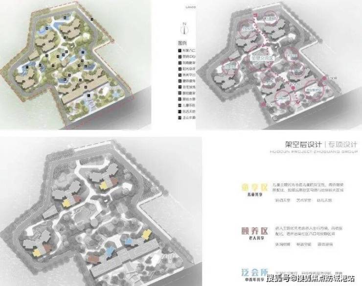 整体规划为 4 大功能区:商业购物区、邻里交流区、全民活动区、童玩基地区。坡地式园林社区,架空层设置童享区、 颐养区、泛会所三大主题,打造高端圈层生活形态。