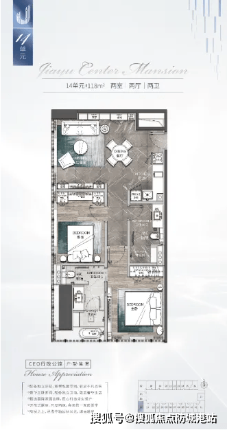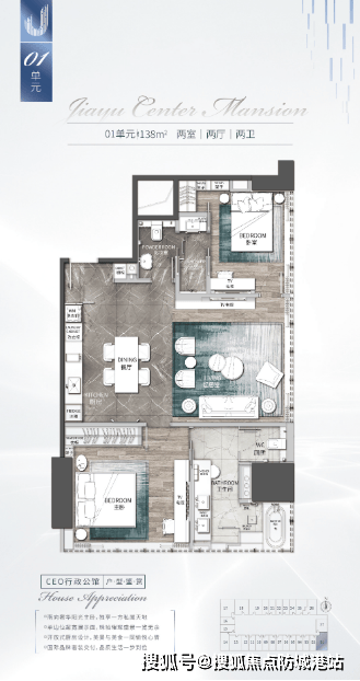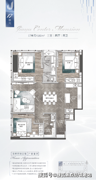 180㎡总统公馆:顶配户型,四房三卫设计,拥有独立会客厅与餐厅,270° 景观视野尽收城市中轴美景;主卧配备双洗手台、浴缸及景观飘窗,满足顶级圈层的居住与社交需求。