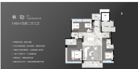 以 168㎡四叶草户型为例,四室两厅三卫的设计,空间布局合理,南北对流,采光通风极佳。户型采用全铝幕墙的流动感设计,同源迪拜公主塔的高端铝材,不仅美观大方,还具有良好的耐久性和隔热性。此外,项目还配备了 M + 科技系统,从空气、饮水、环境等核心要素出发,为业主打造绿色健康的宜居环境。
