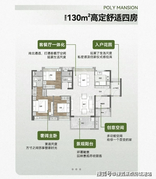 138㎡四房双主套(楼王):四开间朝南(约 15 米南向面宽),超 6 米阳台,南北对流,无遮挡望园林,同面积段稀缺双主套设计。