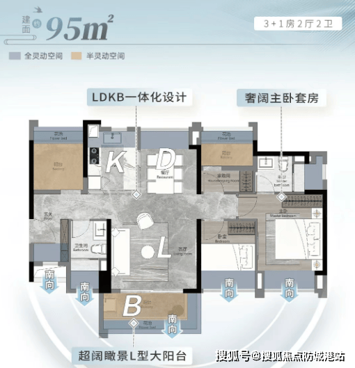 95㎡四房:五开间朝南,超阔观景阳台,动静分区清晰;