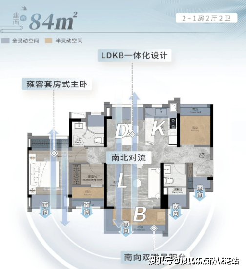 84㎡三房:南向双阳台、U型明厨、南北对流,主卧带独立卫浴;