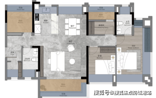 119㎡四房:南园北湖双景,超长玄关提升收纳与私密性,主卧套房配全景飘窗。