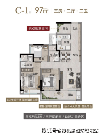 项目提供的户型面积段涵盖了建面约九十七平方米至一百六十八平方米的精工三至四房,充分满足了不同家庭结构的需求。对于刚结婚的年轻夫妇,或者需要照顾老人的多代同堂家庭,这里都能找到合适的空间解决方案。特别值得一提的是,项目在产品设计上融入了高端住宅基因体系,采用了LDK一体化设计理念,即客厅、餐厅、厨房三大公共空间无缝连接,打破了传统户型的界限,让家庭成员之间的互动更加频繁,营造出温馨和谐的家庭氛围。约三点一米的标准层高,相比普通住宅的净高,显得更加开阔大气,有效消除了压抑感。而约六点一米至九点四米的宽景阳台,更是点睛之笔,它不仅极大地拓展了室内的视觉空间,让室内外景观融为一体,更为业主提供了晾晒衣物、种植花草、品茶读书等多种生活场景的可能性。