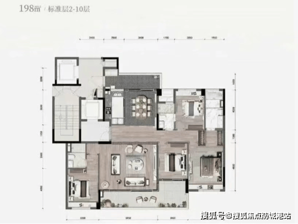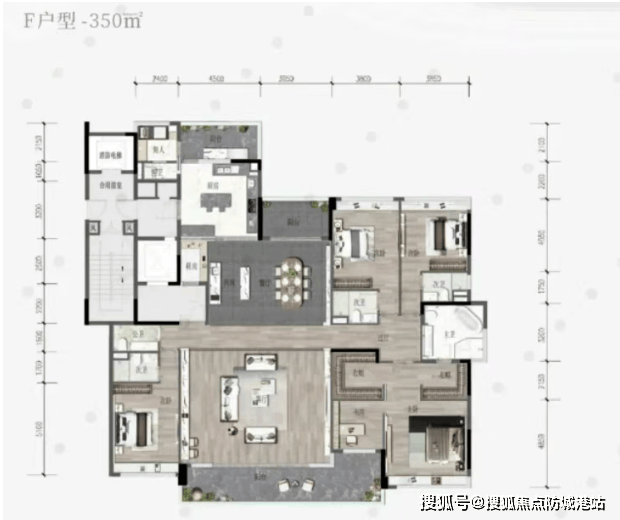 350㎡五房四卫:五开间朝南,9米双面景观阳台,空间可灵活改造为茶室、瑜伽区等,适合多孩家庭或对社交空间有高要求的买家,单价约7.0–7.5万/㎡。