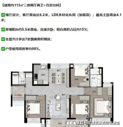 主要户型包括72-133平方米的两至四房,户型布局南北通透,部分户型采用横厅设计,实现客厅及卧室采光最大化。入户花园及景观阳台提升居住体验,百变空间设计满足家庭多功能使用需求。全屋飘窗设计覆盖主卧、次卧、玄关及卫生间,实现室内光照及景观最大化利用。