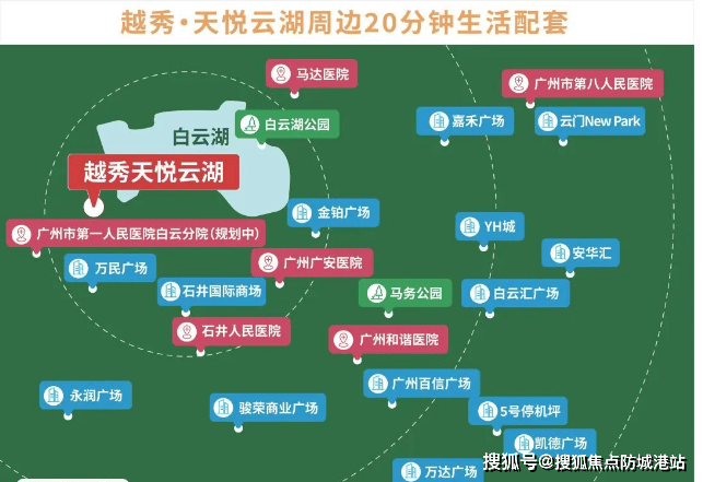 除了自建的商业设施外,周边还有庆丰广场、万民广场等多个大型商业中心,满足居民日常生活需求。此外,项目距离白云湖仅200米,近10公里的绿茵跑道为业主提供了绝佳的休闲锻炼场所。医疗方面,附近有多家医院,包括已敲定落址的综合性三甲医院——广州市第一人民医院,为居民健康保驾护航。