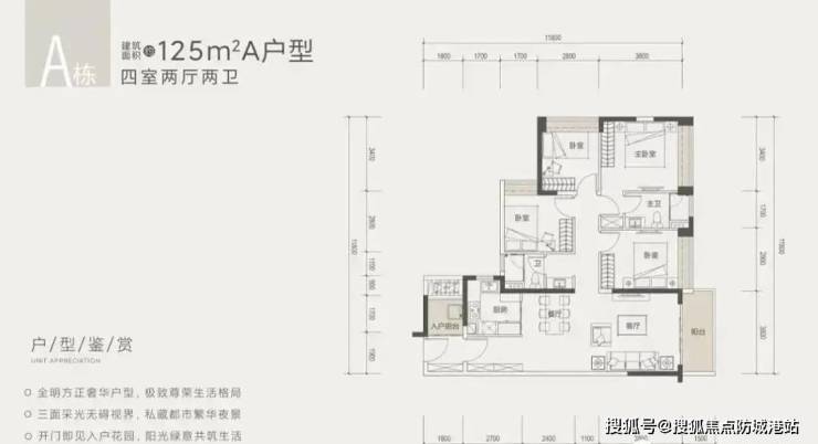 建面约125㎡四房:格局相对方正,均为北向设计。