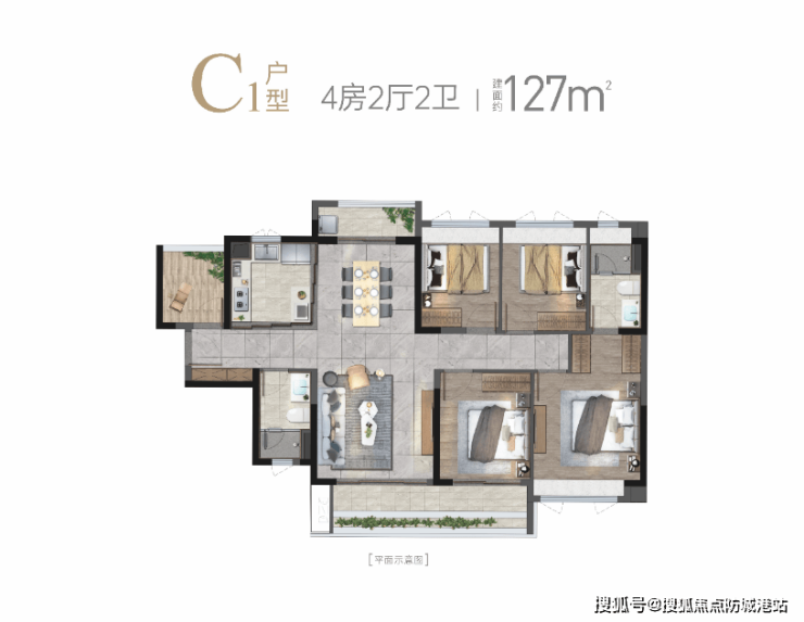建面127㎡四房两卫:南北对流,功能完备