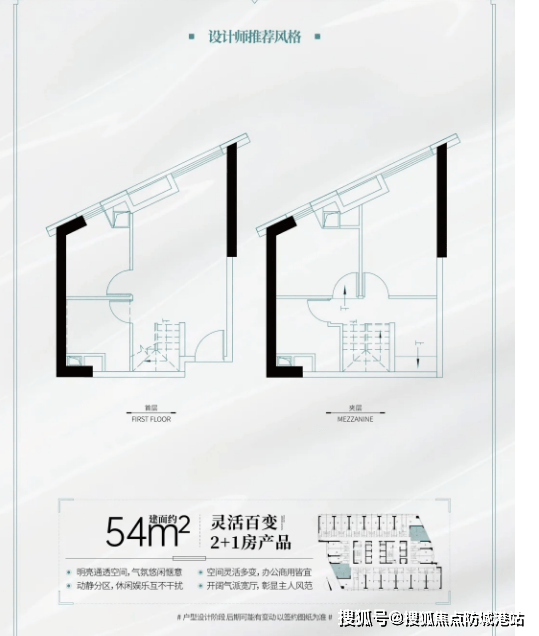 1. 户型布局:该户型为紧凑LOFT户型,整体布局合理,动静分区明确,采光、通风效果良好;同样采用LOFT双层设计,一层为客厅、餐厅、厨房、卫生间,二层为两个卧室,空间利用率极高,无浪费空间。