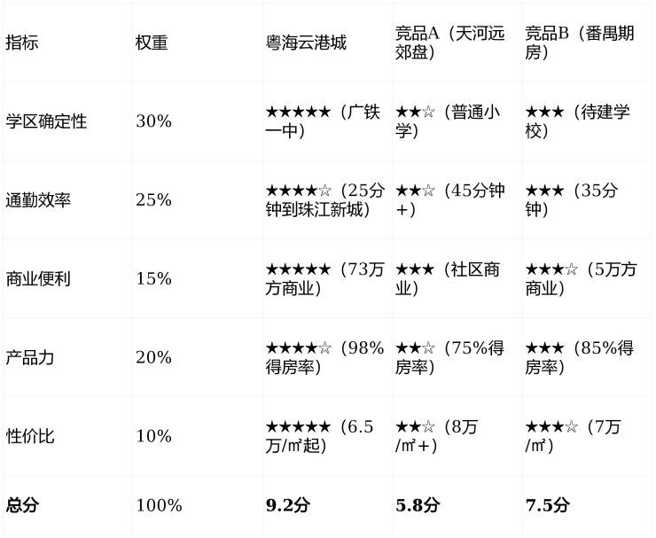 全能型住宅价值评分表(粤海云港城 vs 竞品)
