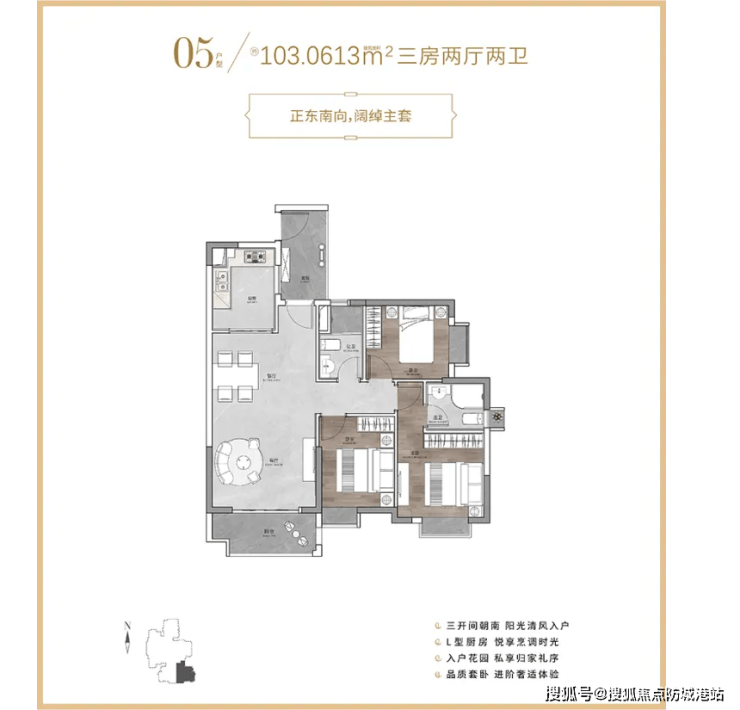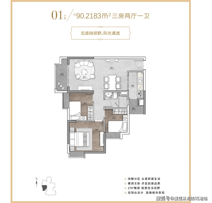 户型亮点:LDKB一体化+双主卧套房+全景落地窗