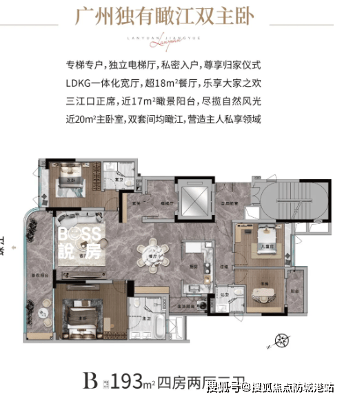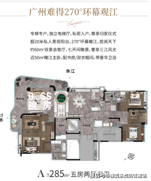 兰园江悦整体建筑规划为18层低密小高层住宅,仅68户,采用一梯一户设计,确保私密性及居住纯粹性。项目仅提供193㎡及285㎡两种江景大平层户型,布局科学合理。每户均为江景全景设计,开平式隐形门、总统套房奢阔尺度、LDKG大宽厅、望江双主套、保姆间等功能区齐全,兼顾舒适、私密及社交空间。285㎡大宅会客厅面积约60㎡,弧形转角阳台270°俯瞰珠江,采光通风极佳,视觉体验优越。